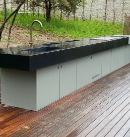 Ein Spülbecken mit Wasserhahn ist bei einer Außenküche äußert praktisch; einfach den Gartenschlauch mit dem üblichen Garten-Stecksystem an die Spüle anschließen und schon haben Sie fließend Wasser. So können Sie in der Outdoorküche das im eigenen Garten gezogene Gemüse putzen und die Küche im Haus bleibt sauber.