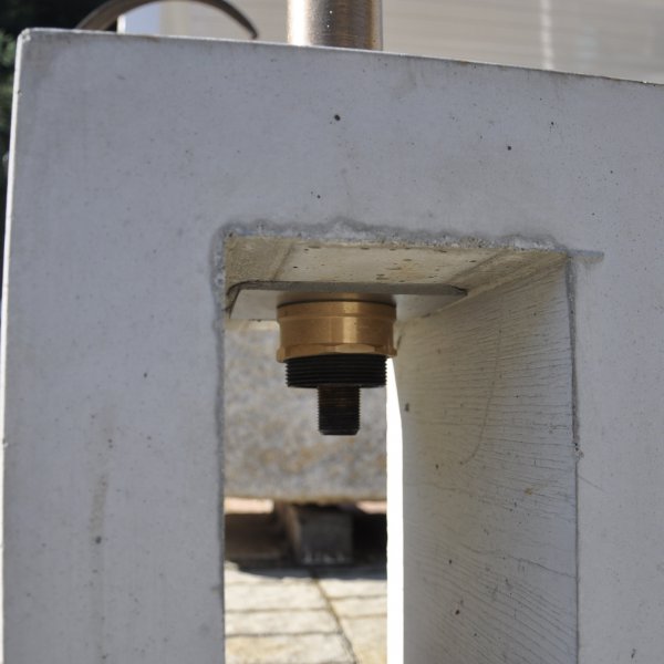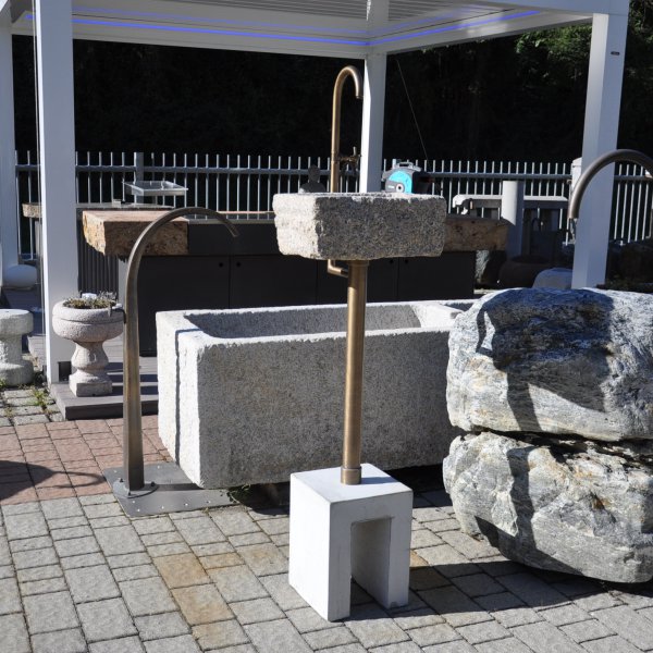 Kleines antikes Waschbecken aus Granit mit integrierten Wasserhahn und Abfluss (Sockel wird eingegraben)