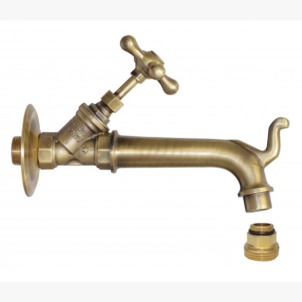 Rustikaler Messing Wasserhahn mit 3/4" Anschluss und Adapter für Schlauchanschluss. Die Rosette ist im Preis nicht inbegriffen. Es gibt verschiedene Größen und Formen. Der Wasserhahn ist für den Au...