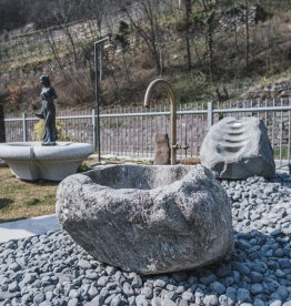 The quartz phyllite is mostly green-gray in color with quartz veins running through it. This stone is mainly found in the Eisack Valley. We prefer to manufacture fountains and washbasins from this beautiful material.
